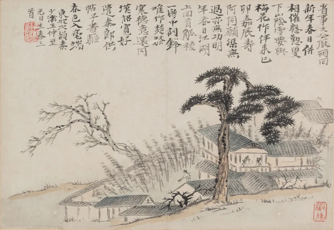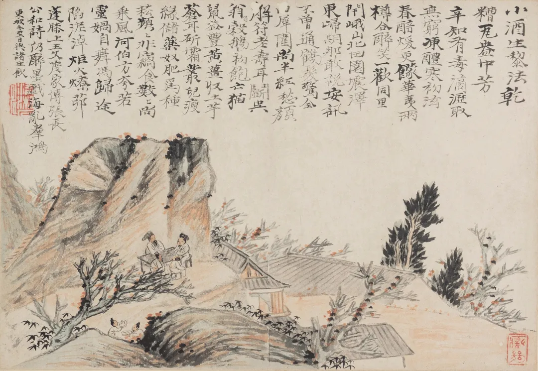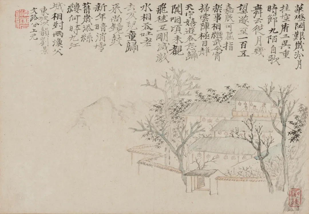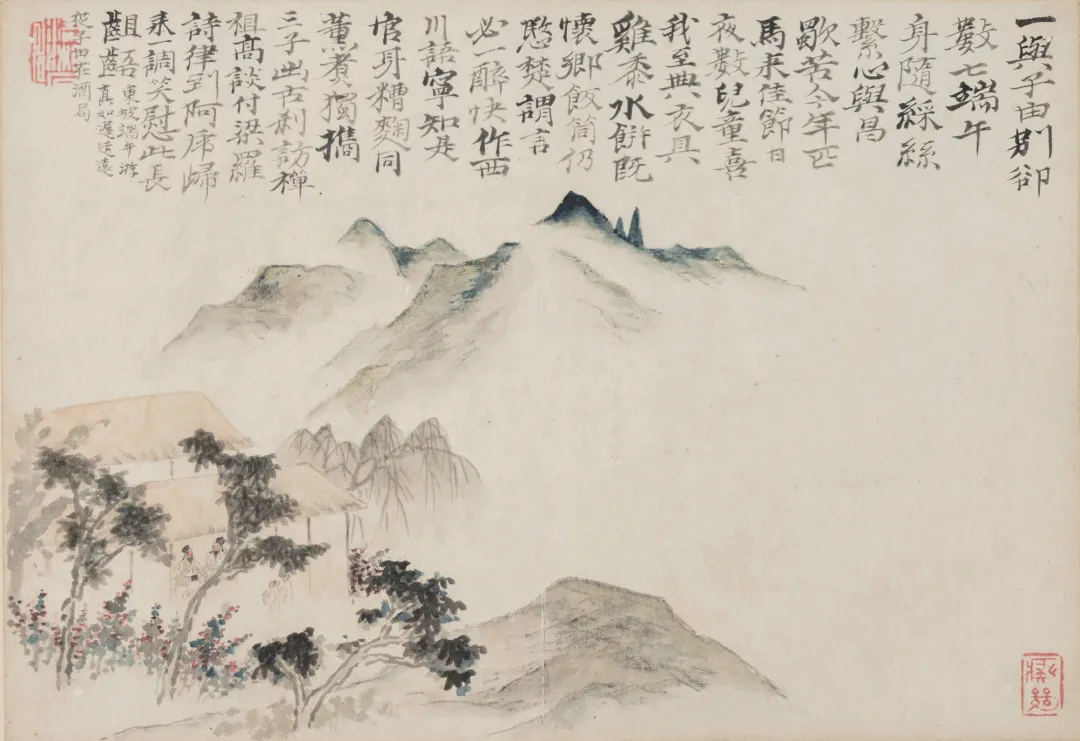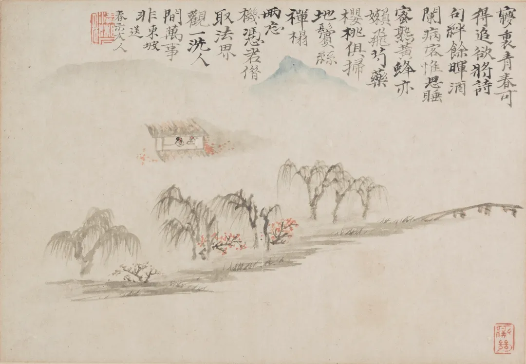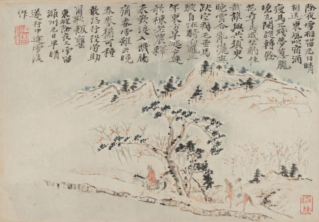 册页以时序为轴,从元日到冬至,串联起苏轼半生漂泊。但石涛并非机械复现诗意,而是以蒙太奇手法重构时空:立春篇绘“东风解冻”,却以枯枝上的一点新绿暗示生机;中秋篇写“明月未出”,却用云雾的流动暗示月光的将至。这种“留白式”的时空处理,既是对苏轼“人生如逆旅”的呼应,也是石涛对自身命运的隐喻——作为明遗民,他如苏轼般历经仕途挫折,却在画中以“未完成”的笔触,保留了对未来的期待。