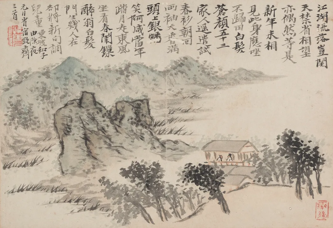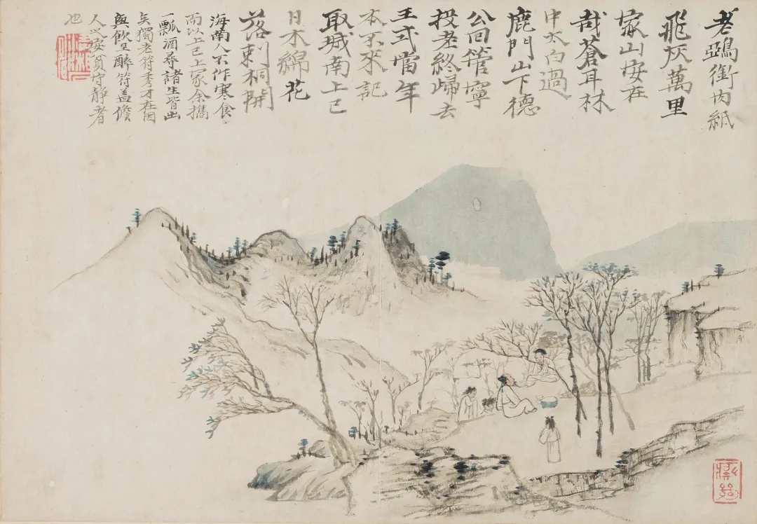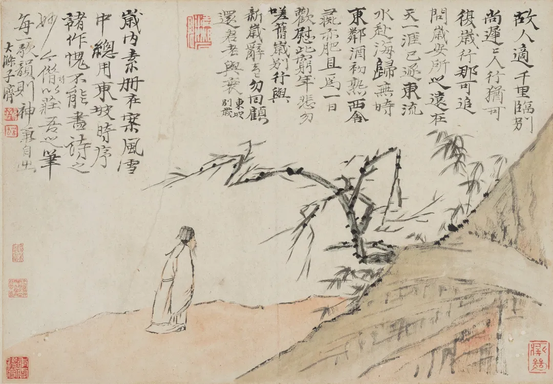 石涛的《东坡时序诗意图册》绝非简单的诗意配图,而是一场跨越时空的“诗画争胜”与“精神对话”。这位明末遗民画家以十二开册页,将苏轼散落于不同年份、不同境遇的时序诗,编织成一部视觉化的“东坡精神年谱”,更在画意与诗意的碰撞中,暗藏对自我命运的隐喻。