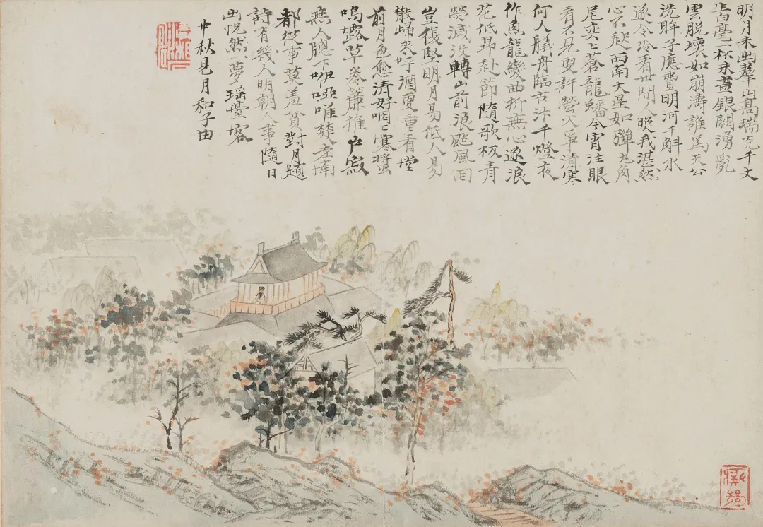 全册最动人的,是那种“未完成感”。石涛故意保留绢本底色,让未渲染处与施色区域形成虚实对话;他以“丑字”题诗,笔画歪斜却力透纸背,恰似苏轼“我书意造本无法”的写意精神。这种“残缺”,既是石涛对“完美”的叛逆,也是他对“无常”的接纳——正如苏轼在诗中写“人有悲欢离合,月有阴晴圆缺”,石涛用画笔告诉我们:真正的艺术,永远在完成与未完成之间游荡。