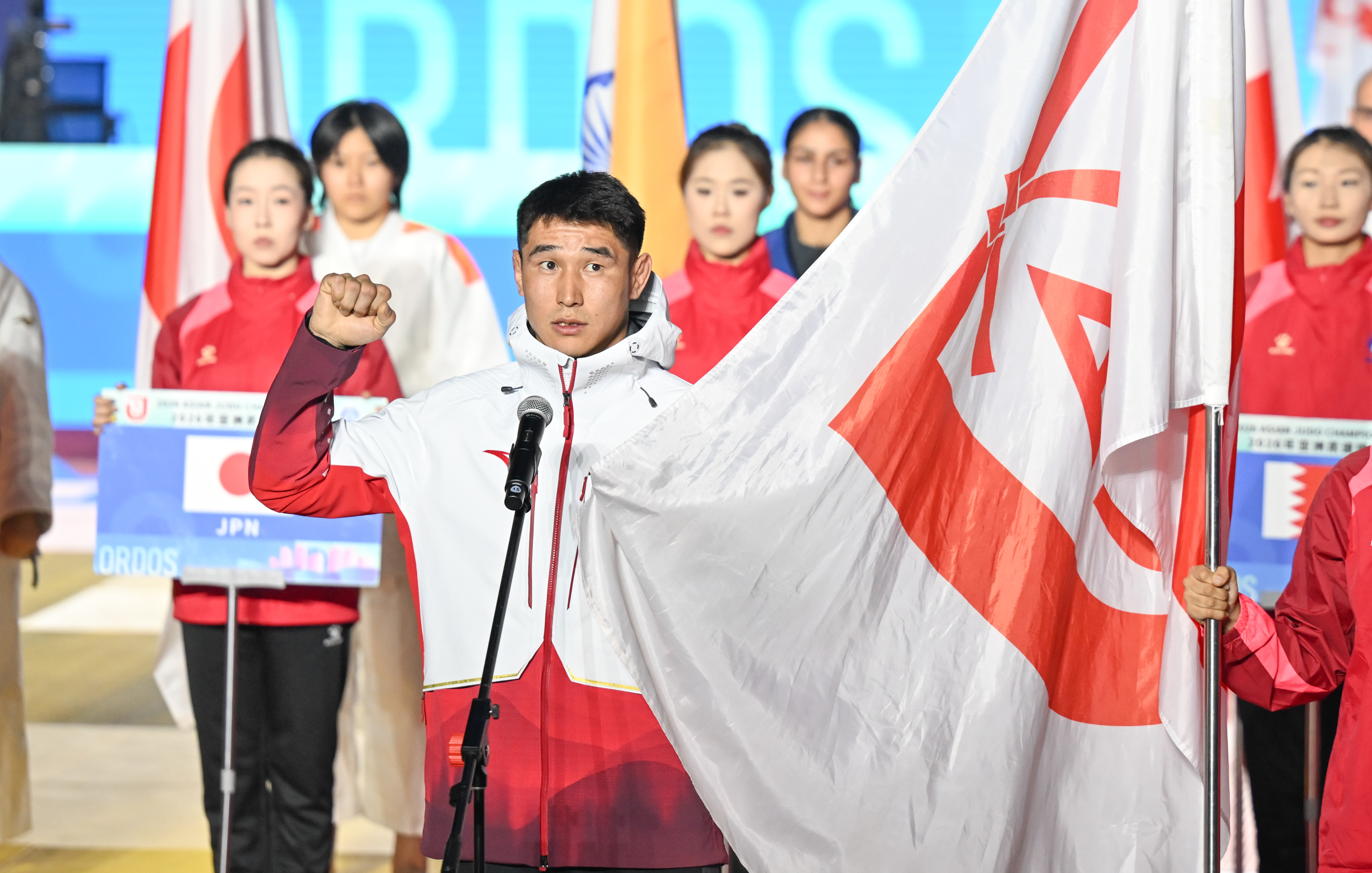 4月16日,中国国家柔道队运动员布和毕力格在开幕式上代表全体参赛运动员宣誓。新华社记者 贝赫 摄