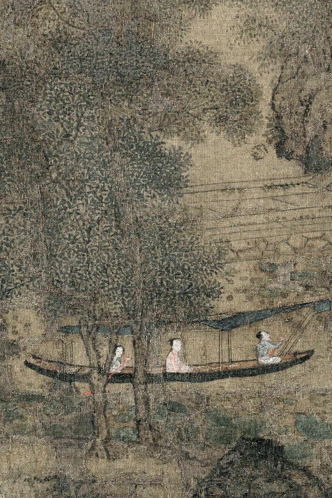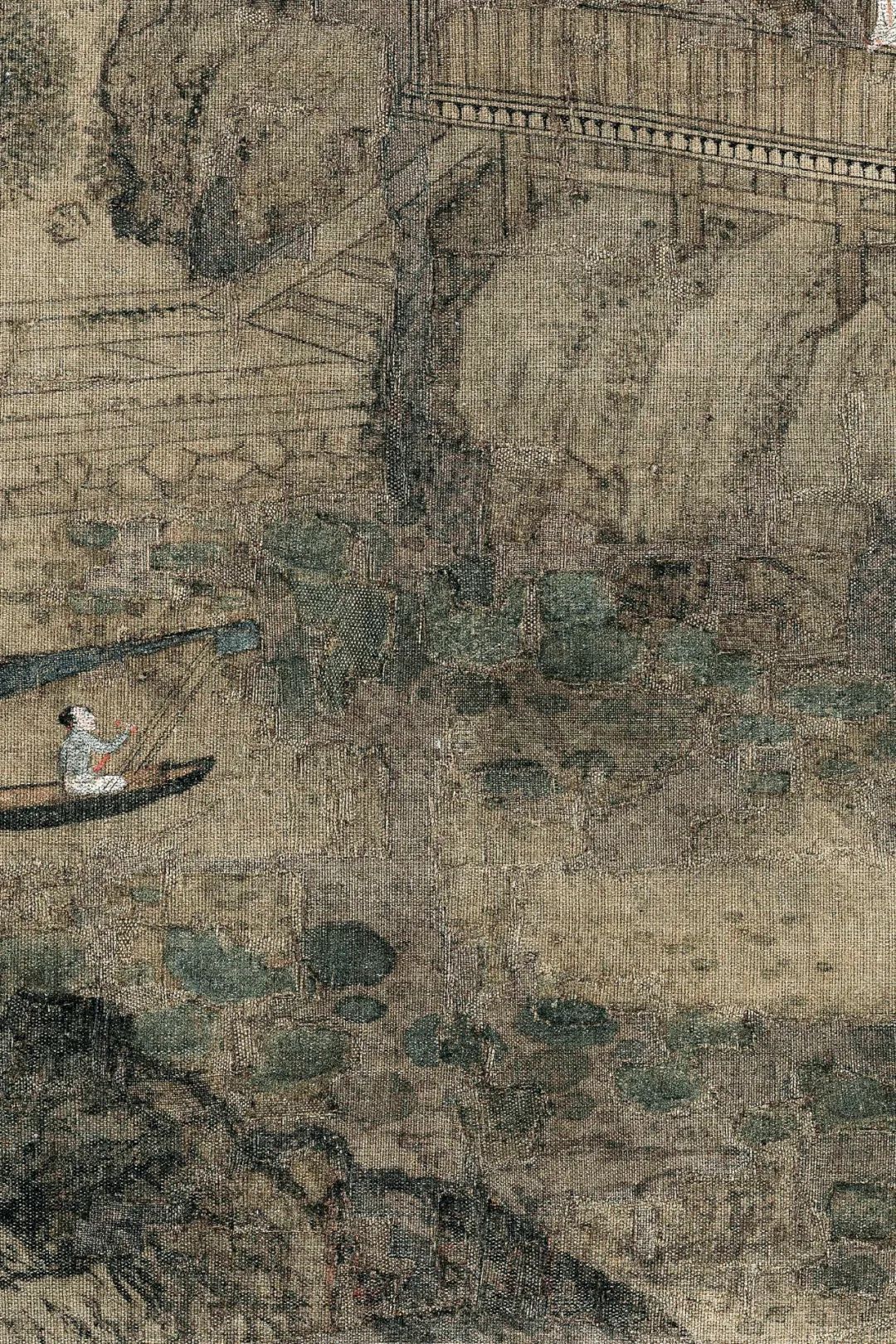 更耐人寻味的是画面中的“动态失衡”。泛舟女子的小艇以蓝顶红桨的浓烈色彩打破整体淡雅基调,却因舟身倾斜的构图制造出不稳定感。这种“险笔”恰是王诜对“平淡天真”的叛逆——他以人工之巧模拟自然之拙,让精致的楼阁与野逸的莲塘形成张力,暗喻文人虽身处庙堂,心却向往江湖的矛盾心境。