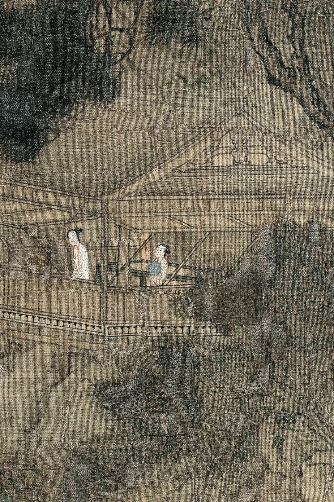 画面中,莲塘以淡墨晕染出朦胧水汽,荷叶仅用数笔勾出轮廓,未施色彩却似有露珠滚动。这种“未完成”的笔法,实则是王诜对“画到生时是熟时”的实践——他刻意保留绢本底色,让未渲染处与施色区域形成虚实对话,仿佛莲塘的生机正从空白处汩汩涌出。水阁中的仕女执扇闲坐,衣纹仅用细笔勾勒,面部未作细致描绘,这种“去个性化”处理,将人物从具体叙事中抽离,转化为观者情感投射的载体。